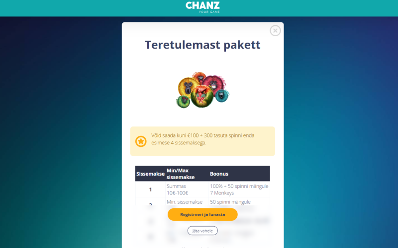 Chanz tervitusboonus saamiseks pead lihtsalt registreeruma uue kasutajana ja tegema esimese sissemakse. Boonus aktiveeritakse kas automaatselt või boonuskoodi sisestamisel, vastavalt hetkel kehtivatele kampaania tingimustele.